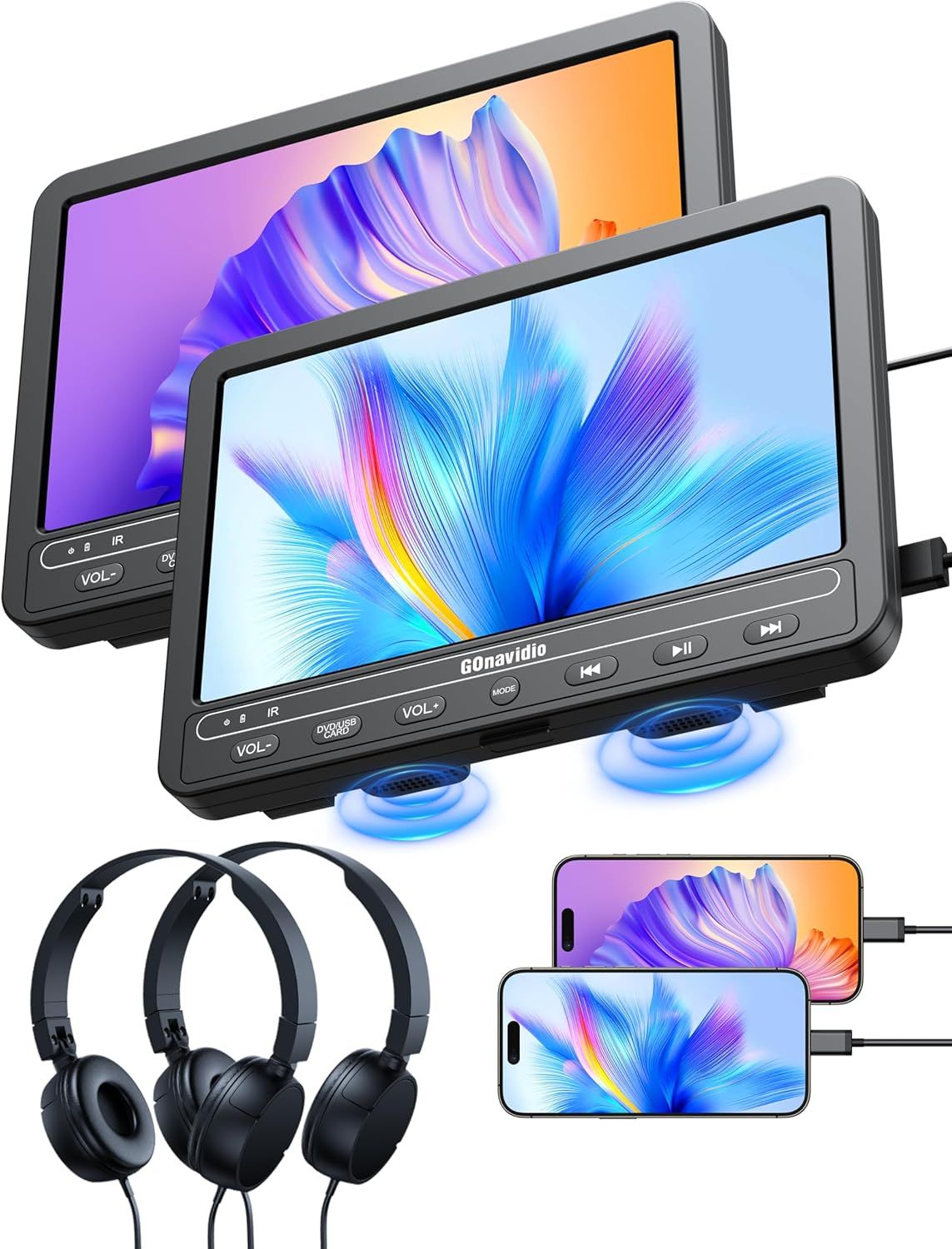 Package Contents Package includes 2 x DVD player, 2 x headrest straps, 2 x remote controls, 2 x headphones, 1 x AV cable, 1 x car charger, 1 x AC adapter, 1 x user manual. We also have 30-day return guarantee and 18-month warranty, if you have any questions about the product, please contact us