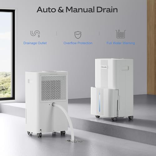Flexible Drainage Options - Home dehumidifiers come with the drain hose, you can continuously drain the collected water without having to manually empty the bucket, included drain hose. Alternatively, use the manual drain option and the dehumidifier will automatically stop when the tank is full, an indicator light and sound seconds to remind you empty the tank, safe and convenient, can be flexibly used in various locations around the home