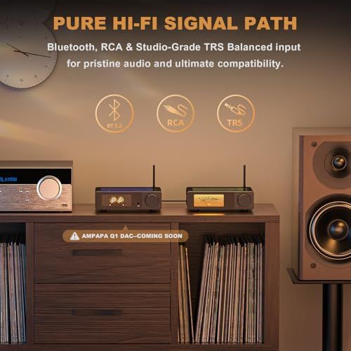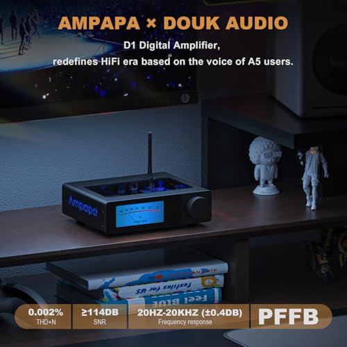 Ampapa × Douk Audio Collaboration: Built on the acclaimed Douk Audio A5 amp, the D1 retains core features like TPA3255 chip, HPF, PRE-OUT, socketed op-amps—now upgraded with digital VU display, TRS balanced input, Bluetooth 5.2, treble/bass control, remote and more for next-gen HiFi performance.