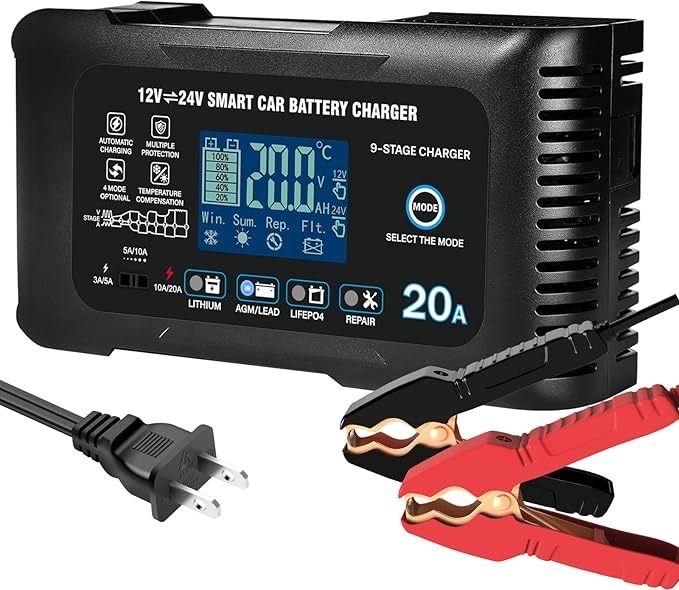 3-LEVEL SMART CHARGING: PRECISION POWER TAILOR - Charging to your battery’s needs with adjustable 12V (5A/10A/20A) and 24V (3A/5A/10A) modes. Designed for LiFePO4 and Lithium batteries, this charger delivers optimized voltage curves to prevent overcharging and extend lifespan. Ideal for AGM, Gel, SLA, and marine batteries—safety meets speed!