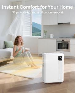Powerful 30-Pint Moisture Removal for Spaces up to 2500 Sq. Ft: High humidity can make rooms feel damp, uncomfortable, and difficult to maintain. This dehumidifier removes up to 30 pints of moisture per day (under 95°F, 90% RH) and helps regulate humidity in spaces up to 2500 sq. ft. Ideal for basements, bedrooms, bathrooms, kitchens, laundry rooms, garages, offices, storage spaces, apartments, and RVs, delivering dependable comfort during humid months