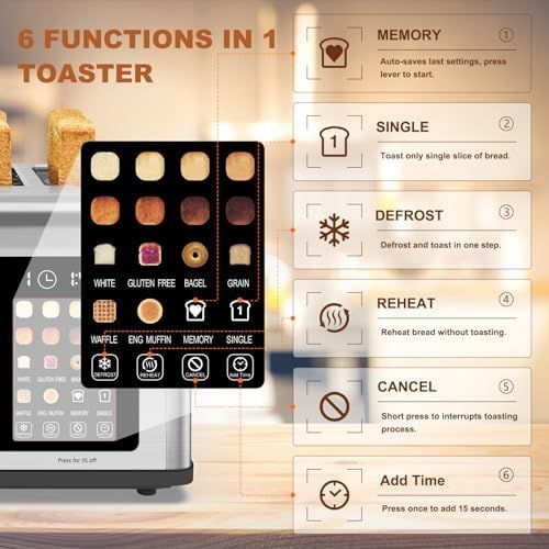 Large Touch Screen: The 4 slice toaster has a large touchscreen to show the shade setting, bread type and countdown. You will know when the bread will pop up with the visual countdown display on the touch screen control panel.\nPeculiar Functions: Except Cancel, Defrost, Reheat functions, we specially added Bread Type, Memory, Sigle slot to toast, Add Time functions. 6 bread type including bagel, white, waffle, eng.muffin, gluten free, grain.\n8 Shade Settings: The 1650W toaster is much faster than regular toasting while heating rapidly. There are 8 shade levels from light yellow to deep dark for you to choose to meet different taste.\nEasy Operation: 1.5in extra wide slots can toast different thicknesses of bread. 2 removable trays to collect the crumbs which can be easily removed and cleaned. Memory function will keep the bread type and shade settings from the last toasting.\nDual Screens & Dual Controls: The 4 slice toaster with 2 touch screen allows you view the toasting process better. Dual independent control panels allow for different settings at the same time, which meet different individual taste. You can also choose 1 slot to toast once select the single function.