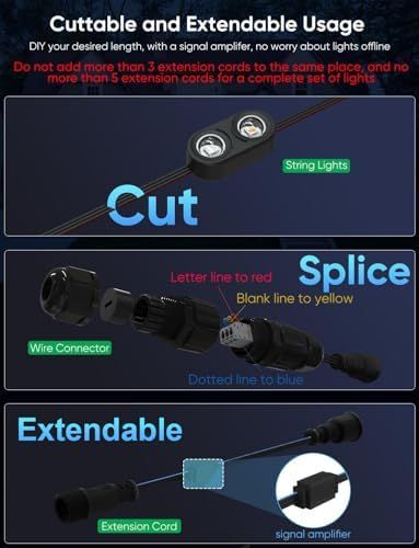 Cuttable and Expandable: The led outdoor permanent lights can be cut and extended with wire connector set or extension cord. The extension cord with signal amplifier ensures that the whole set maintains a stable signal. Please note that a set of lights only can be connected up to 5 extension cords. If it is necessary to cut the light string, please refer to the installation guide for the correct installation method. Reverse connection of the male and female wire connector will cause the light string to not light up. If you want to expand the 100ft set, you need to purchase an additional adapter. Note that the total lights set is up to 200ft with 144W adapter