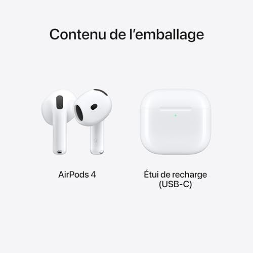 REBUILT FOR COMFORT — AirPods 4 have been redesigned for exceptional all-day comfort and greater stability. With a refined contour, shorter stem and quick-press controls for music or calls.\nPERSONALIZED SPATIAL AUDIO — Personalized Spatial Audio with dynamic head tracking places sound all around you, creating a theatre-like listening experience for music, TV shows, movies, games and more.*\nIMPROVED SOUND AND CALL QUALITY — AirPods 4 feature the Apple-designed H2 chip. Voice Isolation improves the quality of phone calls in loud conditions. Using advanced computational audio, it reduces background noise while isolating and clarifying the sound of your voice for whomever you’re speaking to.*\nMAGICAL EXPERIENCE — Just say “Siri” or “Hey Siri” to play a song, make a call or check your schedule.* And with Siri Interactions, now you can respond to Siri by simply nodding your head yes or shaking your head no.* Pair AirPods 4 by simply placing them near your device and tapping Connect on your screen.* Easily share a song or show between two sets of AirPods.* A skin-detecting sensor knows to play audio only when you’re wearing AirPods and pauses when you take them off. And you can track down your AirPods and Charging Case with the Find My app.*\nLONG BATTERY LIFE — Get up to 5 hours of listening time on a single charge. And get up to 30 hours of total listening time using the case.*\nREDESIGNED CASE — The Charging Case comes with USB-C charging capabilities and is more than 10 percent smaller by volume than the previous generation.*\nDUST-, SWEAT- AND WATER-RESISTANT — AirPods 4 and the Charging Case are rated IP54 dust-, sweat- and water-resistant, so they’ll withstand rain and heavy workouts.*\n* LEGAL DISCLAIMERS — This is a summary of the main product features. See below to learn more.