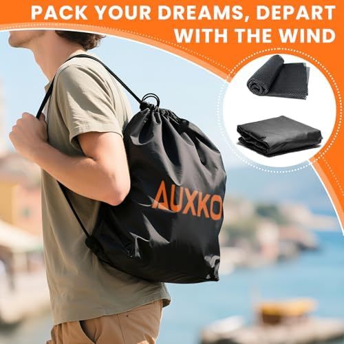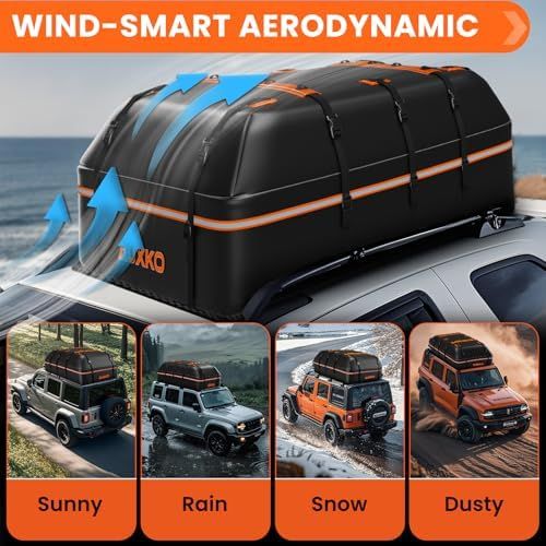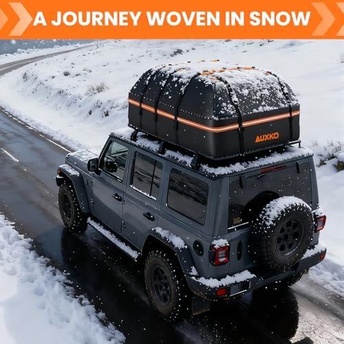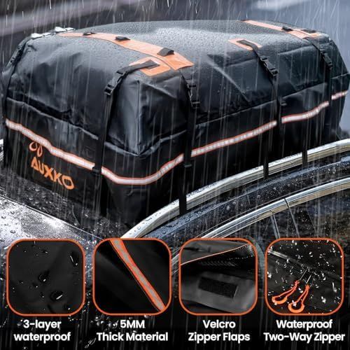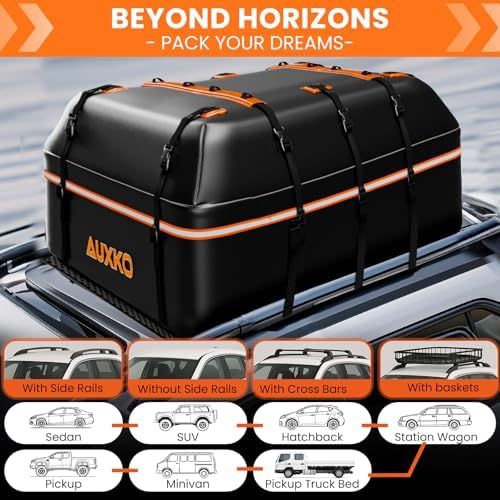 \"\nUniversal Fit & Extra Large Capacity: This massive 22 cubic feet rooftop cargo bag is engineered to fit sedans, SUVs, truck, truck bed, and vans. Whether it’s camping, moving, or cross-country travel. This roof bag offers room for everything—up to 8 suitcases, sleeping bags, tents, and more. Ideal for big families or long road trips.\nAerodynamic & Triple-Layer Waterproof design: AUXKO 22 cubic ft rooftop cargo bag is uniquely designed with an angled front panel that reduces drag and wind resistance. Drive smoother, quieter, and save on fuel—especially at highway speeds. Constructed from 5mm thick PVC, it withstands extreme heat, heavy rain, and snow. A waterproof flap and high-strength Velcro seal the zipper, ensuring your gear stays completely dry in any weather.\nDrive Secure & Theft-Resistant Design: For safer night drives, our bag includes a night glow logo and wide orange reflective webbing. Be seen from all angles—even in low-light conditions, fog, or storms.The anti-theft combination lock protects your valuables while parked, and the high-visibility strip ensures safety in low-light conditions, fog, or storms driving. Whether day or night, your items stay secure and your vehicle stays visible.\nStable & Anti-Slip Design: The included anti-slip mat keeps your rooftop cargo bag firmly in place, even at highway speeds or on rough roads. Unlike flimsy alternatives, our textured mat grips tightly without scratching your car’s paint. This prevents shifting, reduces wind noise, and eliminates the need for frequent adjustments. Whether tackling sharp turns or sudden stops, your cargo stays stable—no slipping, no damage, just confidence on the road.\nCompact Storage & Easy Installation: Whether or not they have roof racks. With 6 reinforced straps, anti-slip mat and 6 door hooks, these offer secure installation and steady positioning. When not in use, this rooftop cargo carrier folds down flat for convenient storage in your trunk, garage, or closet. Unlike bulky hard-shell options, our foldable roof bag offers the same storage performance without taking up space. Ideal for occasional use or spontaneous adventures.\n› See more product details\"