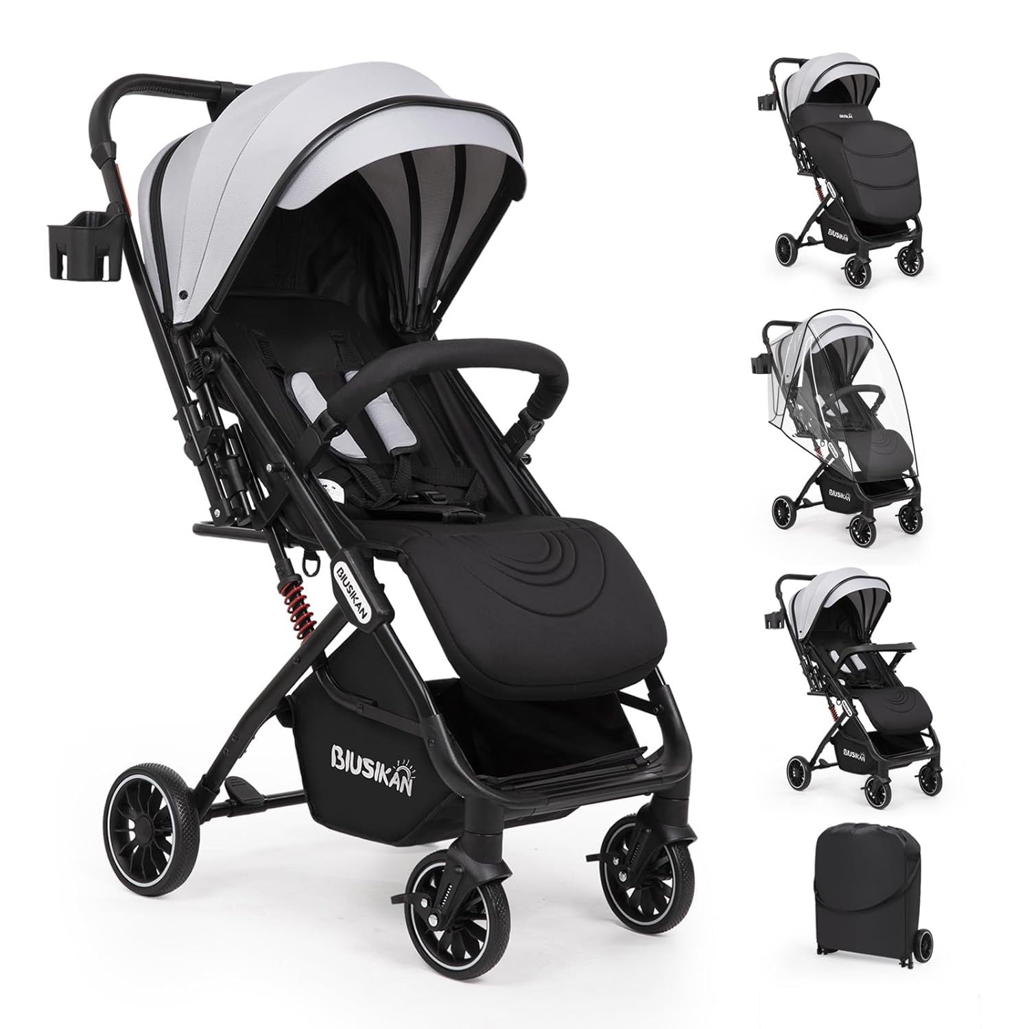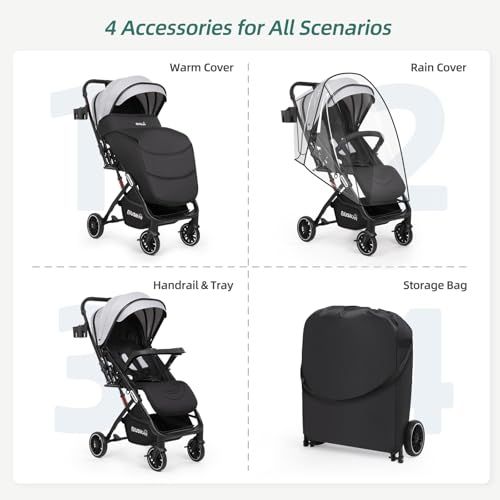 Aluminum Alloy + 300D Oxford Elastic Fabrics + Polyester+ Rubber Wheels MULTI-SCENE FRIENDLY USAGE - Travel stroller combines a rain cover, footrest, snack tray, travel bag, and cup holder, providing all-weather protection and winter warmth. Creating a comfortable, safe travel experience for you and your baby SAFETY IS KEY - Baby safety is the top priority. Baby stroller meets or exceeds the highest safety standards of the CPSC and ASTM. Toddler stroller features a 5-point harness and independent brakes on front and rear wheels, with rubber tires for safety ALL-WHEEL SUSPENSION DESIGN - Toddler Stroller has independent suspension, with foot-activated brakes at the rear and a separate brake system at the front for locking direction. Effectively absorbs vibrations, pathways, sandy, and gravel LIGHTWEIGHT & Two Way Push - Stroller is lightweight and foldable for easy transport and storage. Spacious storage bag accommodates all baby essentials on the go. Two Way design allows your baby to face forward, exploring the world, or face towards you SUNSHIELD & COZINESS - Baby Stroller features a premium UV-protective canopy with an adjustable UPF 50+ sunshade that helps block sunlight in all directions, as well as two viewing windows to ensure airflow