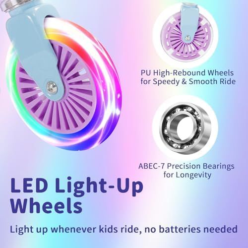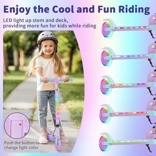 Ride for the Fun: With battery powered LED lights on the stem and deck that can be powered on or off, 5 color changing modes create lighting effects that look like the lights are jumping or cascading or chasing each other, making children\'s ride super fun and unique. The light-up folding scooter features LED flashing light up wheels, no batteries needed. Lights get brighter with the faster your kids go.