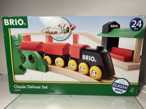 22 pieces with train engine, 2 train cars, 14 track sections, crossing bridge, Brio station and 3 trees