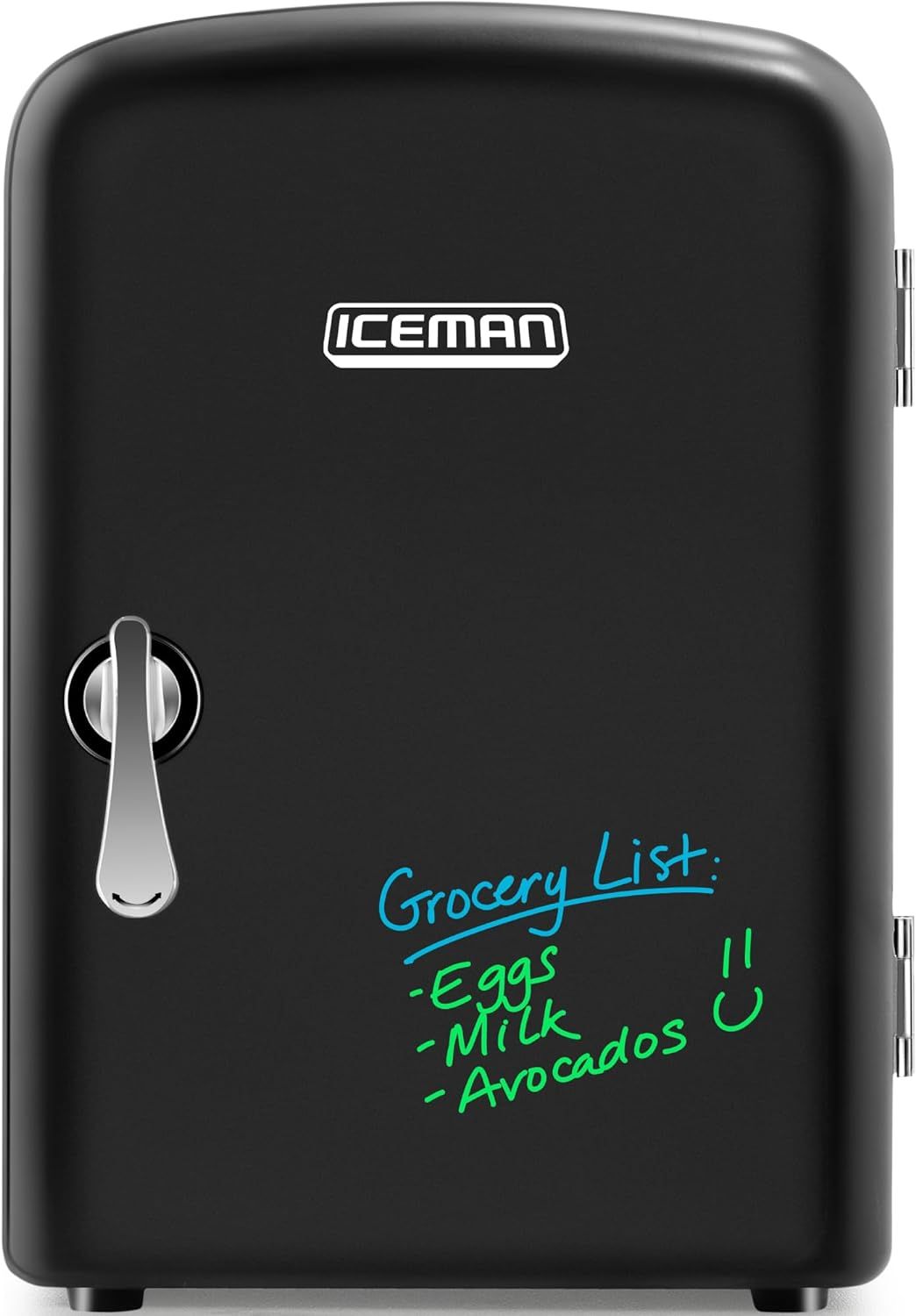 PERFECT PORTABILITY: Its small size, sleek design and convenient carry handle, makes it easy to take the mini fridge with you on the go! Great for personal spaces, travel, offices, dorms, road trips, boating, camping, tailgating, commuting, and more! The eraser door is great for writing notes, leaving messages or using just for fun!