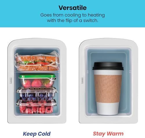 COMPACT SIZE: 4 Liter capacity chills six 12 oz. soda cans; interior is 5 x 5 x 7.5 and includes removable shelf so you can store small items such as yogurt, fruit, milk, juice, smoothies, bottles, cheese, coffee, soup; the possibilities are endless.