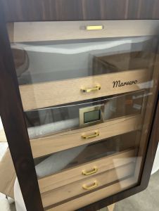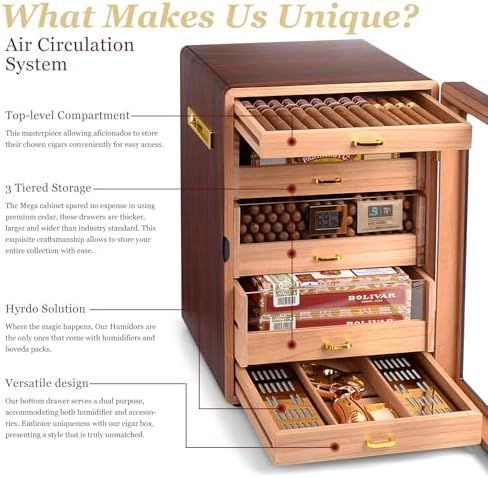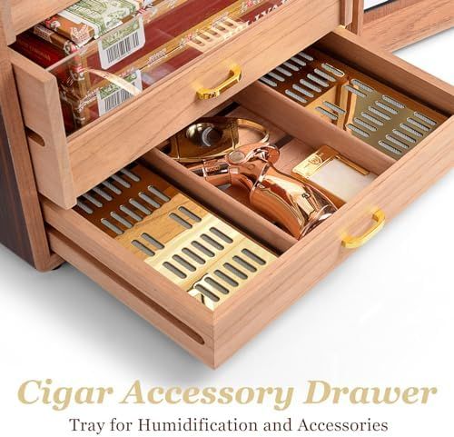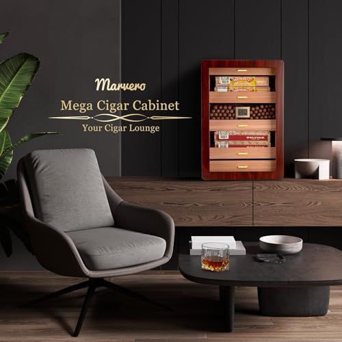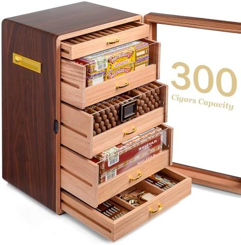 300 CAPACITY: The Cigar Humidors provides 5 movable cedar drawers with handles. Each drawer is fits for most electric cigar humidifiers\nSEE-THROUGH DESIGN: This Cigar Cabinet uses a double glass door design. The outer glass gives you the best view, the inner is help for keeping temperature & humidity steady when open the door frequently\nACCURATE HUMIDITY CONTROL: The digital thermo-hygrometer reads humidity and temperature with high precision, with 2 humidifiers and 2 humidity packs providing each drawer a slow and steady release of moisture to keep humidity level properly\nMARVELOUS DESIGN: Marvero humidor crosses into new terrain by adapting Rounded cabinet design, Brown walnut drawer and double side gold-plated hardware. These improvements make our humidor unique in the market\nGREAT GIFT CHOICE: The antique design and packaging makes our Humidor a gift idea for all Cigars aficionados