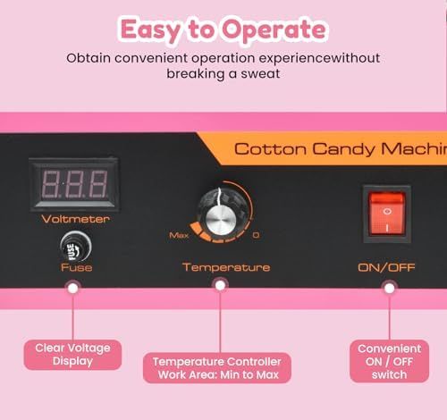 Temp Control - Our electric candy floss maker features a voltage meter and a temp control knob. Changing the voltage allows you to adjust the temperature from 176°F to 194°F. If you want to try different flavored sugars, you will need this