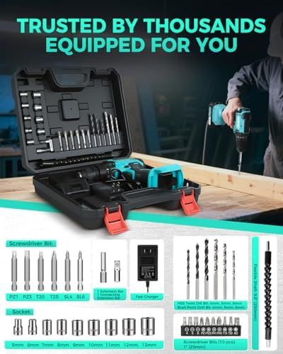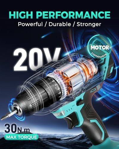 \"\n【20 Voltage & 2 Variable Speeds】 Higher voltage means more torque-spinning strength to overcome resistance. This 2 variable-speed ( 0-350 & 0-1300 RPM ) cordless drill with an adjustable clutch gives you the versatility for drilling different materials and using a variety of bits. The low speed is for driving screws, the high speed is for drilling holes.\n【25+1 Position Clutch & 266 In-lbs Max Torque】 This cordless drill\'s clutch provides precise control for drilling, which helps to prevent sinking a screw too deep, stripping out the head of a screw or even breaking a screw shaft. 17-Torque allows for various applications and additional 1-torque for drilling.\n【1500mAh Batteries & 60min Fast Charger】20V 1500mAh Lithium-Ion battery packed with higher capacity indicator lets you finish your job smoothly with long lasting performance. 1.5A 1-hour fast charger keeps your drill constantly running.\n【3/8” Keyless Metal Chuck & LED Work Light】A 3/8-inch cordless drill accepts a wide range of bits, making it versatile for common tasks around the house. Drill has keyless chuck that you can tighten or loosen by hand. The Forward/Reverse switch allows you to either screw or replace/remove bits for your purposes. LED Light for increased visibility in enclosed workspaces and dark environment.\n【23 Pcs Drill Bits Accessories & Compact Storage Case】Our electric cordless drill/ driver kit with 23 Pcs accessories: 3 x HSS Twist drill bits, 3 x Brad Point drill bits, 16 x Screwdriver bits, 9 x Sleeves, 1 x Extension Bar, 1 x Flexible Hex Shaft. A storage case is suitable for home Improvement & DIY Project.\n› See more product details\"