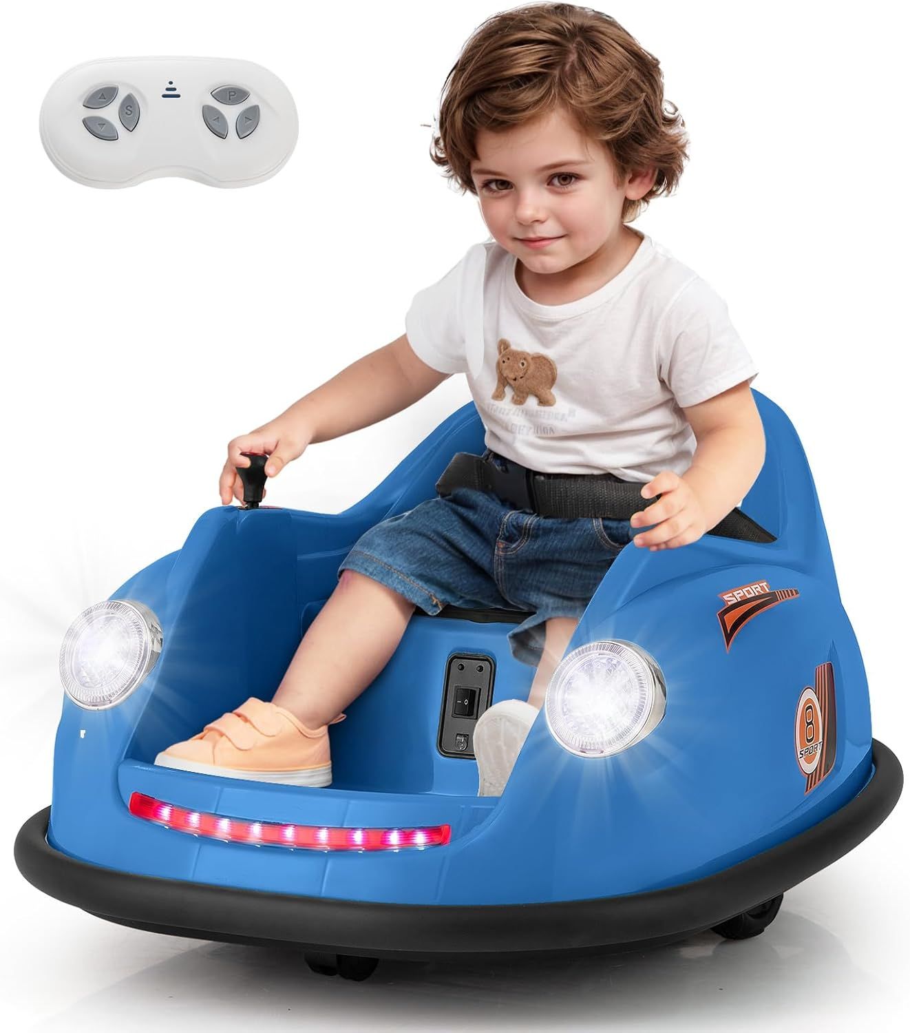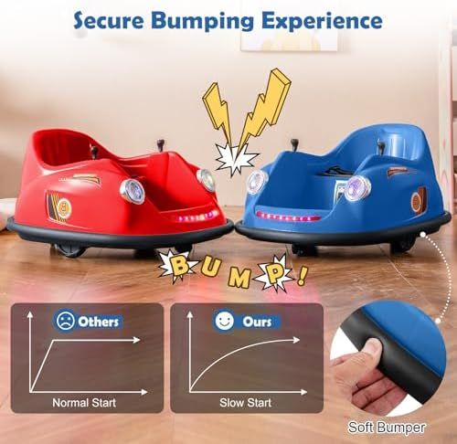 360°Spin and Enhanced Security: This toddler bumper car boasts a full 360-degree spin capability, made possible by its 2 universal wheels. The slow start function enhances safety compared to normal start. Additionally, the adjustable safety belt ensures toddlers remain securely in place for a secure bumping experience.