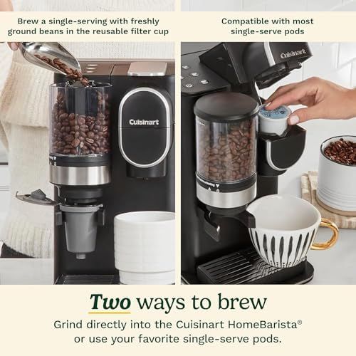 SINGLE-SERVE: Enjoy three serving sizes with push button control – 8-ounces, 10-ounces or 12 ounces – compatible with any brand of single cup pod including Keurig K-Cup pods with an optional reusable filter cup so you can use your own coffee through our HomeBarista Cuisinart features