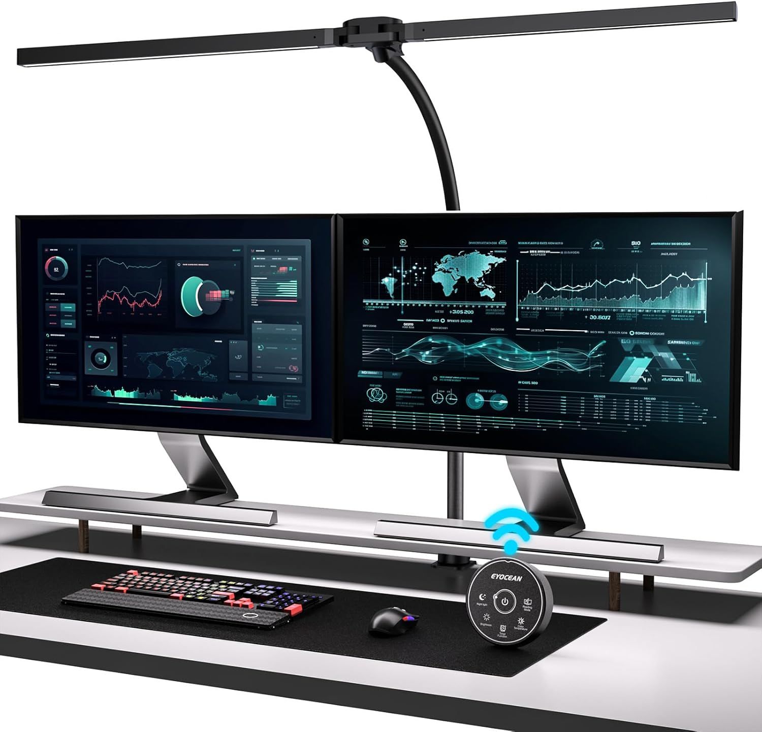 【Remote Control & Gesture Control】This Monitor lamp is equipped with a wireless remote control, allowing you to control the light more portablely. It also features gesture control, allowing you to turn the light on and off simply by waving your hand. It is ideal for large monitors or dual monitors and architect desks, etc., allowing you to have a good lighting environment when working, studying, drawing, etc.\n【Asymmetrical Optical Design】Our LED desk lamp adopts an asymmetrical optical design, eliminating screen reflections, no blue light, no glare, and a soft light source to protect your eyes from fatigue. The memory function remembers your last settings; no reset is required. It also has a timer function.\n【31.5in / 80cmUltra-Wide Light Source】 Built-in 160 eye-protecting LED chips (80 cool white lights, 80 warm lights), 5 color temperatures x 5 brightness levels to achieve a variety of light combination modes. It also has four preset modes to meet your different lighting needs. Our lamp head is made of high-quality aluminum alloy, which has good heat dissipation ability and long service life and does not need to be replaced.\n【Adjustable gooseneck & Telescopic rod】The high and stable telescopic rod (adjustable height: 31.5in - 41.3in) made of metal in conjunction with the flexible gooseneck offers flexible height adjustment and multiple lighting angles. The strong metal clamp supports a tabletop of up to 2.7 in and saves valuable space on your desk.\n【What You Will Receive】1x Desk Lamp with Clamp (Material: aircraft-grade aluminum alloy, matte black finish); 1x Remote Control; 1x UL Adapter (length: 71 inches/180 cm); 1x User Manual; 2 Years Worry Free Warranty. If you have any questions, please feel free to contact us.