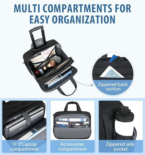 ROLLING LAPTOP BAG: The wheeled laptop case features a padded 17.3 inch laptop section and tablet section, saving your devices from scuffs and scratches. Constructed of polyster canvas fabric for durability and water repellency, protecting your accessories in the snow, as well as in the light and medium rain. Size: 18.1”x9”x14.2 (L x W x H) Handle: Up to 21.7” Weight: 6.33LBS.