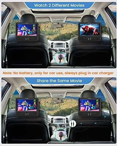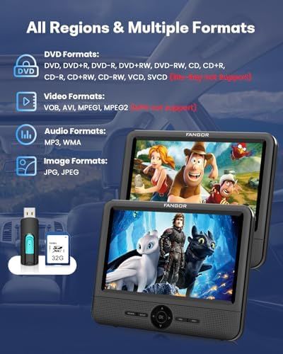 【2 x Car DVD Player】FANGOR New generation 7.5\\\" dual car dvd players adopt newly chip technology, provides crystal clear image, has stable performance even during bumpy rides. The car dvd player support playing different movies for kids or playing the same movie simply via AV cable connecting(Equipped with 2 IN 1 high quality car charger, only use for car, without built-in battery)\n【All Regions and Multiple Formats Support】This portable dvd player for car can play all regions discs. DVD Formats: DVD, DVD+R, DVD-R, DVD+RW, DVD-RW, CD, CD+R, CD-R, CD+RW, CD-RW, VCD, SVCD, SVCD(Except Blu-ray disc). Design with USB, SD (support max to 32GB FAT32 and 720 x 576 pixels), you could play multiple videos,audios,images. Video Formats: VOB, AVI, MPEG 1, MPEG 2. Audio Formats: MP3,WMA. Image Formats: JPG,JPEG\n【Upgraded Dual Powerful Clearer Stereo Speakers】FANGOR headrest dvd player has two upgraded stereo speakers that makes sound louder and clearer, bring kids perfect listening experience. Volume can be adjusted separately by player or remote. Each player has the headphone jack so kids can connect wired headphone to enjoy their favorite cartoons\n【Last Memory Function and Car Headrest Straps Included】 Fangor 7.5 inch car dual dvd players support last memory function, no need to worry about starting from the begining, it picks up each exciting scene from where you left last time. Come with two customerized headrest straps,easy to install to car headrest, also can be conveniently moved to other back seat or vehicles\n【100% Worry-fr-ee Purchase】We provide replace-ment within 365 days and professional technical support. If you have any questions or needs, please directly let us know via the \\\"Get Product Support\\\" on Amazon or after-sales email, we will reply within 24h. (PS: If you have missed any accessories or received the broken item in the package, we will send you the new one)\n【Warm Tips】The dual dvd players are designed for car use only, there is no battery inside of devices, ac adapter is also not included in the package. Package contents: 2 x Car DVD Players, 2 x IR Remote, 2 x headrest straps, 1 x Car Charger, 1 x AV Cable, 1 x User Manual