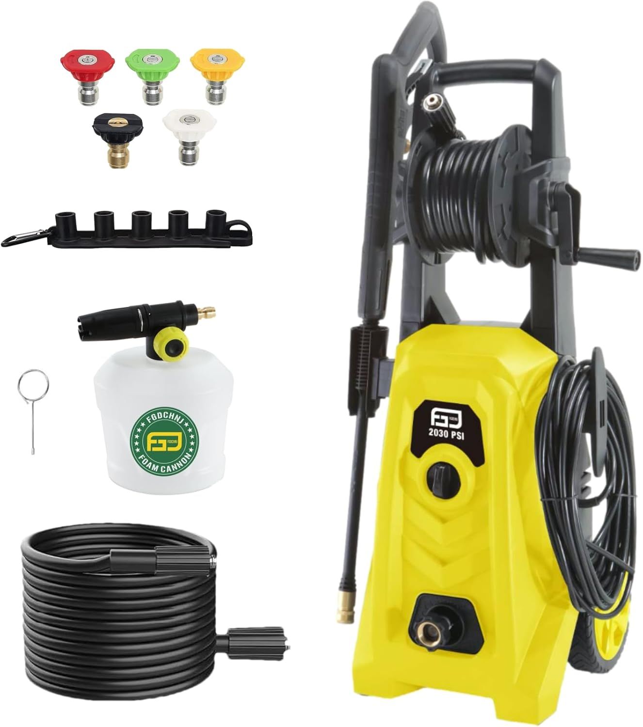 【The Whole Package】1 x Pressure Washer, 1 x 25ft (7.62M) pressure washer hose, 1 x Water Inlet Coupling, 1 x 20ft (6M) High Pressure Hose, 1 x Spray Gun, 1 x Lance, 4 x Quick-Connect Spray Nozzles, 1 x 1000ml Spray Foam Cannon, 1 x Needle Clean-out Tool, 1 x User Manual. PLUS: 24/7 friendly customer service! Please feel free to contact us for any inquires.