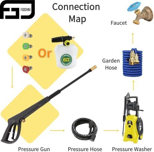 【Upgraded Foam Cannon】Upgraded the Removable Detergent Tank to Quick-Connect Foam Cannon. The upgrade will bring more efficiency to the cleaning jobs. 1/4\" quick-connect fitting. Capacity: 0.22 Gallon (1000ml). Water regulator (+)(-) controls the amount foam produced. Adjustable Spray Nozzle changes the spray pattern from Fan to Cylindrical.