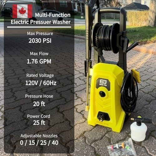 【Powerful Motor】Packed with a powerful 14.5-amp/1800-Watt copper motor, per CSA test standards FGDCHNJ electric pressure washer generates up to 2030 PSI of water pressure and 1.76 GPM of water flow for maximum cleaning performance. Under typical load, working pressure is 1450 PSI. Good enough for most cleaning jobs.