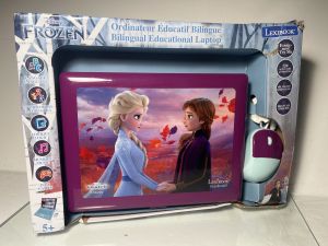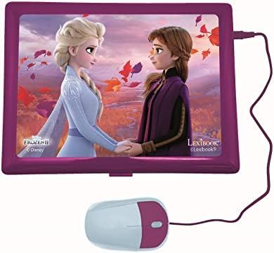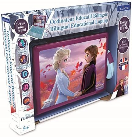 Educational laptop with 124 activities (62 in each language) for a fun and interactive learning experience featuring Frozen!\nLarge 5.1 x 9.7 cm screen. Educational content: Languages, Mathematics, Typing, Logic, Music.\nFun activities with different levels to learn, test and improve your knowledge.\nErgonomics inspired by real laptops, with a realistic mouse and keyboard. Slim and elegant design.\nAlso includes many games to have fun after learning.