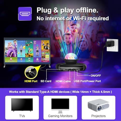 Plug & Play Dance Party in 5 Minutes:No Wi-Fi? No problem! Simply connect via HDMI to your TV/PC/projector in just 5 minutes. Upgraded IC chip delivers ultra-smooth 4K visuals. The built-in 9 AR camera games, smart camera captures your every move, rendering your figure in real-time on the screen for an immersive experience. The disco ball lights create instant club vibes. Host epic kids’ birthday battles or family game nights effortlessly.