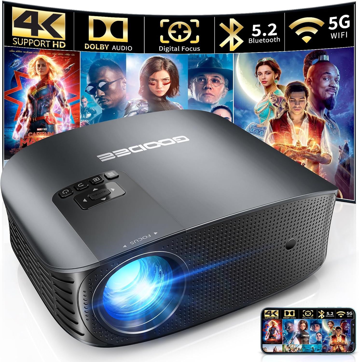 4K Projector Support & 800 ANSI Lumen: GooDee all new upgraded mini wifi projector adopts 6 layers high Refractive glass lens which means this portable projector will deliver a evenly distributed, no-blurry-edges image; Using Germany imported chips and Japanese native light bulbs which bouble level up the image brightness, clarity, color richness, restore the authenticity of color to the maximum extent. Best suits for indoor outdoor use\nElectric Focus and 4P/4D Keystone Correction: This theater projector is an innovative product with upgraded electric focus correction functions. The remote uses the latest infrared high-precision sensor, which can easily focus clear rectangle images by clicking the remote. And we design multiple image setting so as to meet different projection direction of our customer. You don’t need to move the home theater projector to adjust the size of image. Zoom function allows you shrunk the image size from 100%-50% at the same place. Whats more, newest 4 point keystone correction allows you customize image size and direction.4 corners of the picture can be adjusted separately\nFaster & Stable 2.4G/5G WiFi 6 & Bluetooth Connection: Owning GooDee projector with wifi and bluetooth, which allows you to synchronize smartphone screen by both 2.4G and 5G WiFi 6, Ultra-fast 5G WiFi offers you much smoother and lag free online video streaming experience. Just one -time wifi connection. By connecting newest built-in 5.2 Bluetooth, you can enjoy the various bluetooth speaker sound\nDolby Audio & Built-in Hi-Fi Stereo Speaker: As a multi-function home cinema projector, YG600 Plus has built-in 2* 5W speaker giving a ultra clear and powerful sound. Just one click to start your night life. Genuine Dolby authorization, so that you will no longer have only the picture but no sound, and enjoy the ultimate 3D surround sound\nNo More Black dot & Lifetime Technical Support: Adopting imported High-tech materials, it can block dust and prolong the life of the projector. GooDee provides a lifetime technical support, if there have any questions, please feel free to contact us. 7x24 online\nOffice Display: This ceiling mount projector support 360°flip which means front, rear and ceiling installation are acceptable. Built-in office suite, just enjoy the ppt excel word freely