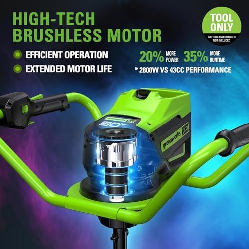 80V brushless motor provides power and durability while being ultra-quiet (80dB) 58cc 2-stroke engine equivalent with 210 RPM (forward motion) and 50 RPM (reverse) 81 ft-lbs. torque Three LED Lights illuminate work area Parts required