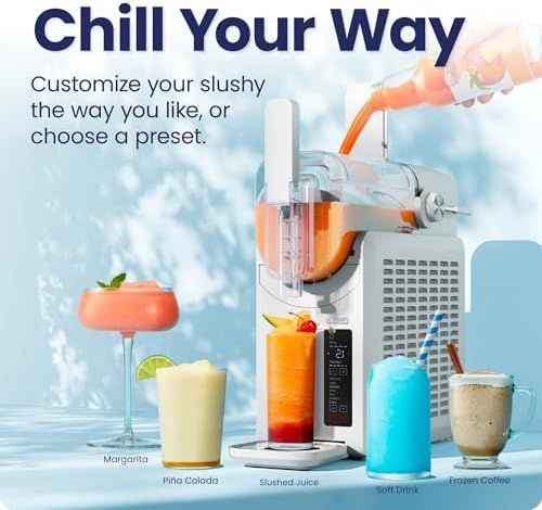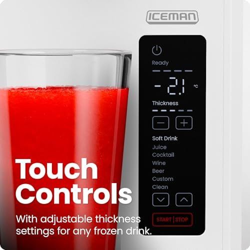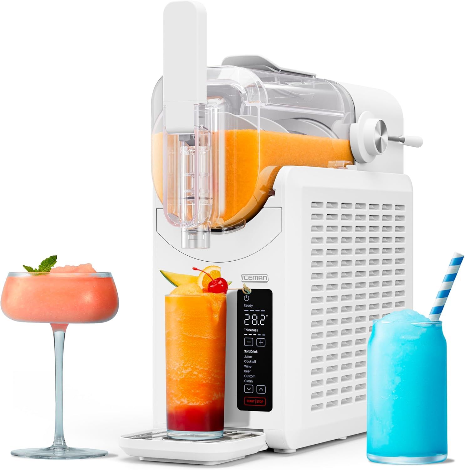 \"\nFREEZES WITHOUT ICE: Make slushies out of any beverage you can think of right at home on your countertop: no ice required! Perfect for a classic cherry slushy or frosé, this one-touch drink maker also works as a frozen margarita machine and a frappe maker!\nQUICK FREEZING: This slushie maker works fast to make sure that you can enjoy a cold, refreshing drink as soon as possible. Start sipping in as little as 20 minutes after starting the machine! Drinks must contain sugar to freeze properly, and freezing times may vary based on temperatures, drink contents, and more.\nINTUITIVE TOUCH CONTROLS: Picking your ideal slushy settings has never been easier! Choose from five different presets that let you adjust the thickness to your ideal consistency. This slushy machine has options for soft drinks, juices, wine, beer, and cocktails which you can start with just the push of a button.\nCOMFORTABLY SERVES 6: The spacious 68-ounce tank is perfect for catering to the crowd. The max fill line of 48 ounces is recommended to avoid spills while slushies are being made and produces six 8 oz servings.\nANYTHING YOU CAN THINK OF: Get creative with this slushie machines “Custom” option for your own innovative beverages! Adjust the temperature and duration for frozen cold brew in the morning or a new twist on Gatorade after football practice.\nEASY TO DISPENSE: No scoops or spoons needed for this drink maker. Gently pull on the lever and this 48-ounce frozen drink machine dispenses directly into your cup and enjoy your favorite frozen drinks. The slushy machine is under 7 inches wide and 17.5 inches long to fit anywhere on your countertop.\nMAKE CLEANING A BREEZE: The built-in cleaning function cycles soap and water through the tank without any added effort. For an added touch, detach the tank and auger to rinse clean in the sink or the dishwasher.\nRESOURCES: cETL approved with advanced safety technology for long-lasting durability and a 1-year assurance provided by Iceman. 200W/120V—RJ62-WHITE-CA\n› See more product details\"