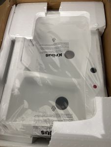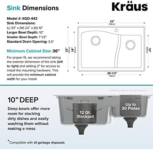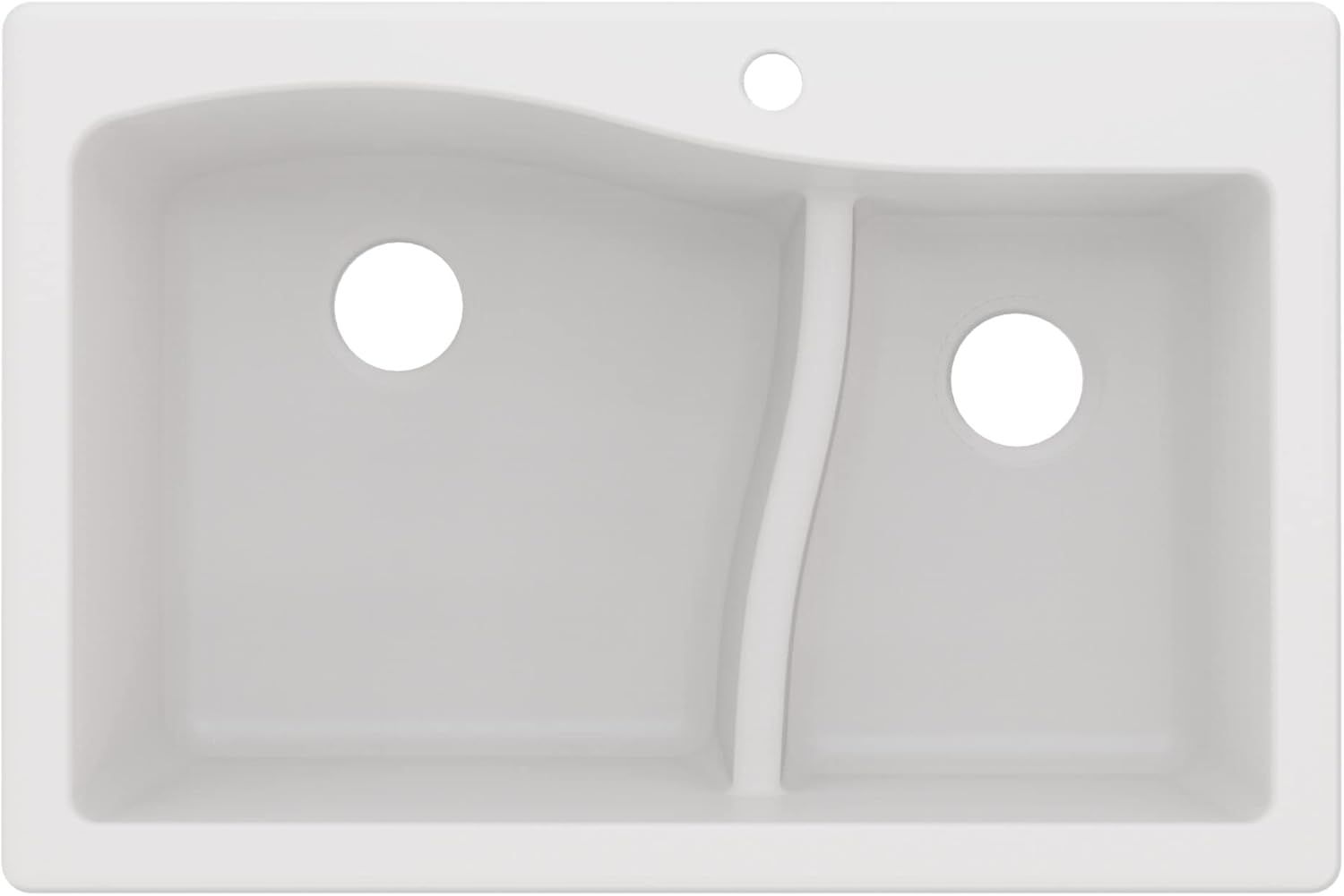 EXTERNAL DIMENSIONS: 33” L x 22” W x 10 5/8” D – BOWL DIMENSIONS: Larger Bowl 18 1/8” L x 18” W x 10” D; Smaller Bowl 11 7/8” L x 16” W x 7 1/2” D – MIN. CABINET SIZE: 36” – KIT INCLUDES: White kitchen sink, mounting hardware, cut-out template