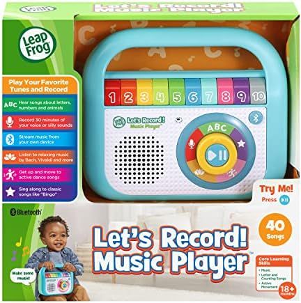 Get creative and record your voice or silly sounds; store up to three minutes of audio on each button, 30 minutes total Kids can get up and boogie to 10 active songs, then relax to 10 lullabies and classical music Sing along to 10 favorite children\'s songs, then play 10 learning songs about letters, counting, animals, the weather and more Bluetooth wireless technology lets you stream music, soundscapes and more from your own device Intended for ages 18+ months; requires 4 AA batteries; batteries included for demo purposes only; new batteries recommended for regular use Play tunes, record songs and sounds, and learn about letters, counting and more with this easy-to-use music player for babies, toddlers and preschoolers; makes a perfect gift Target gender: unisex
