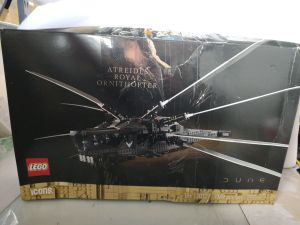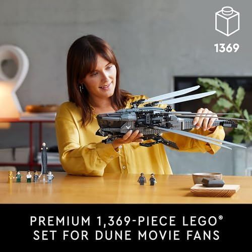 \"\nDune building set for adults – Collectible LEGO Icons Dune Atreides Royal Ornithopter building project for fans of the Dune 2021 movie\nWhat’s in the box? – Everything you need to craft a LEGO replica of the Dune Atreides Royal Ornithopter aircraft with foldout, flappable wings and deployable landing gear, plus 8 movie minifigures\nMinifigure character lineup – Includes Paul Atreides, Lady Jessica, Gurney Halleck, Chani, Leto Atreides, Liet Kynes, Duncan Idaho and Baron Harkonnen in his long robe\nA movie collectible for build and display – This LEGO replica can be displayed in flight or landing modes and comes with 8 Dune minifigures for creating epic movie scenes\nA movie-themed adult gift idea – Give this LEGO Icons Dune Atreides Royal Ornithopter construction set as a gift for Dune movie fans and sci-fi lovers\nMindful LEGO projects for adults – This LEGO Icons project is part of a range of advanced building sets designed for adults\nDimensions – This 1,369-piece model, with wings folded out, measures over 9 in. (23 cm) high, 22 in. (57 cm) long and 31 in. (79 cm) wide\n› See more product details\"