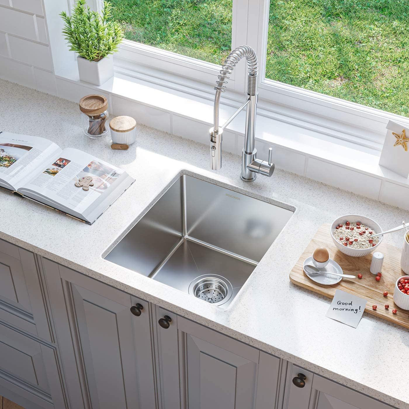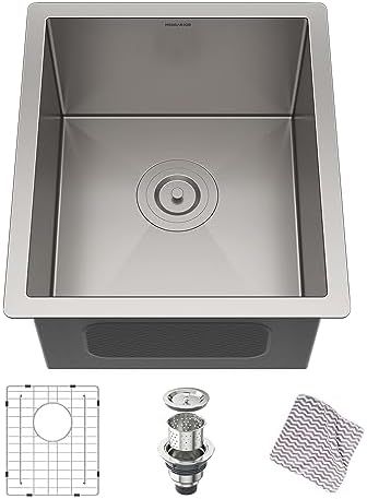 Optimized for Small Spaces: This 15 x 17 inch stainless steel prep sink is the perfect fit for tiny homes, RVs, or kitchen islands—ideal as a compact undermount bar sink or a second sink in larger kitchens\nHeavy-Duty Construction: Made from premium 304 stainless steel, this small RV sink is built to withstand daily wear, whether used as a laundry sink, bar sink, or prep sink in tight areas\nDeep Bowl for Practical Use: Despite its size, this 15 x 17 bar sink offers a deep single bowl that’s perfect for rinsing produce, washing glasses, or functioning as a compact utility sink in laundry rooms\nUltra Quiet Sink Design: Fully equipped with noise-reducing pads, this undermount stainless bar sink minimizes clatter—making it ideal for wet bars or shared spaces like RV kitchens and island prep areas\nLow Maintenance Surface: Thanks to its brushed finish, this prep bar sink resists water spots and fingerprints—ideal for anyone seeking a stylish yet functional small stainless steel sink\n› See more product details