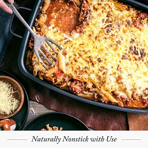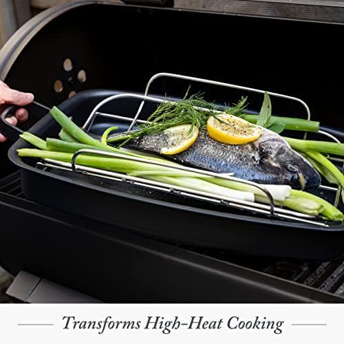 Amazing for searing on the grill or roasting in the oven, this spacious roaster fits a whole turkey or chicken Pre-seasoned, Carbon develops a nonstick patina with use: the more you cook the more nonstick it gets Lightweight and quick heating carbon steel delivers cast iron performance without the weight or the wait Oven safe up to 660°F Metal utensil safe Riveted steel handles provide a sturdy grip Ships with a protective silicone coating, just wash and start cooking Show More › See more product details