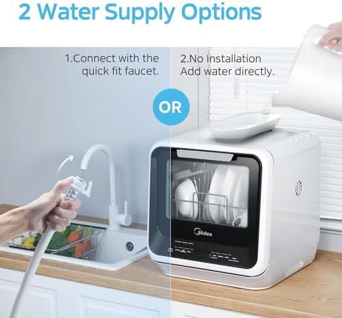 Please make sure the distance between your countertop and wall cupboard is more than 19.6 . No installation needed : Adding water manually in the 5L built-in water tank, you can put the dishwasher in any suitable place without connecting to tap water. Or it can be hooked to the kitchen faucet directly with the included water hose (Adapter included)