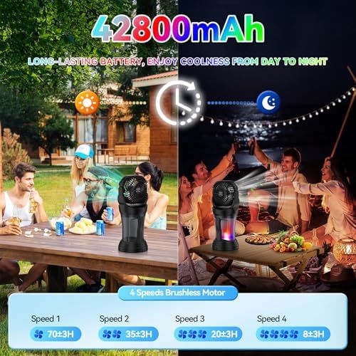 UPGRADED COOLING 2 IN 1: 42800 mAh high capacity battery runs for up to 12 hours at high speed in fan-only mode and up to 60 hours at low wind speed. Battery powered fan with Cool Mist Mode releases a delicate cold mist while sending air, allowing you to enjoy a cool mist in the sweltering air. The misting fan is an indispensable partner for hot summer days.