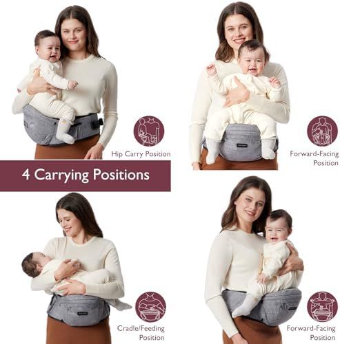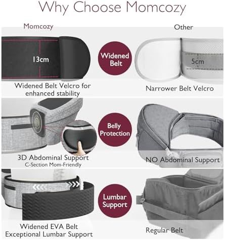 C-Section Mom-Friendly Design: The Innovative 3D abdominal support and widened waist belt feature an EVA massage pad that relieves abdominal pressure. The seat evenly distributes the baby\\\'s weight, alleviating pressure on parents\\\' back and shoulders. The widened magic tape and buckle design provide double protection for your hips.\nComfortable and Ergonomic Design: The ergonomically designed seat places your baby\\\'s hips in the pediatric-recommended \\\"M\\\" position, reducing strain on the adult\\\'s spine. The 30-degree inclined seat brings your baby\\\'s body closer to you for enhanced safety and a more intimate experience.\nMultiple Carrying Positions: Momocozy Hip Seat Carrier is suitable for newborns up to 36 months (or 45 pounds). It offers multiple positions: inward-facing, outward-facing, side carrying, and feeding position. This provides your baby with various options to adjust their sitting posture, allowing for more interactive moments and making outings with your baby a breeze.\nMultiple Storage Pockets: Momocozy Hip Seat Carrier also functions as a diaper bag, featuring multiple storage pockets. Store diapers and wipes in the concealed storage space beneath the seat, essential items like keys and phones in the side pockets, and baby bottles in the designated holder. It can also be compactly folded for easy transport of your baby essentials during travel.\nLightweight & Versatile: Momoczoy Baby Hip Seat Carrier weighs less than 1 pound, making it a breeze to carry. It also doubles as a diaper bag with a spacious storage compartment. The Momcozy hip seat is designed to accommodate parents of various body types, with two sizes available: M (27-45 inches waist) and L (40-55 inches waist). Please measure your waist before placing an order.\n› See more product details