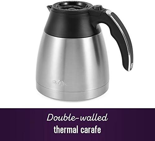This Mr. Coffee 10-Cup Thermal Programmable Coffee Maker features Optimal Brew—it provides the fullest, richest flavor extraction by brewing coffee 20% faster*, at a temperature of up to 205 degrees *Compared to model BVMC-SJX39 Brew a bolder cup of coffee with the touch of a button with the Strong Brew selector This Mr. Coffee coffee maker features a double-walled, stainless steel thermal carafe that holds the temperature of a fresh cup of coffee every time, keeping coffee hot for hours This convenient, programmable coffee maker also has a Brew Later feature that lets you set the coffee maker ahead of time, and wake up to freshly brewed coffee Grab-A-Cup Auto Pause allows you to enjoy a cup of coffee before brewing is done The freshness timer monitors how fresh the coffee is from the time it was brewed, so you know you\'re getting a fresh cup The removable water reservoir makes filling and cleaning easy