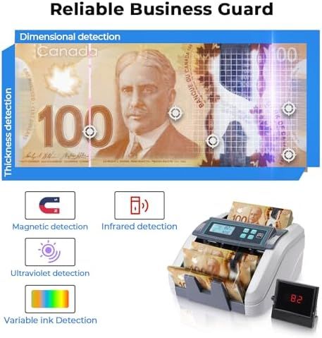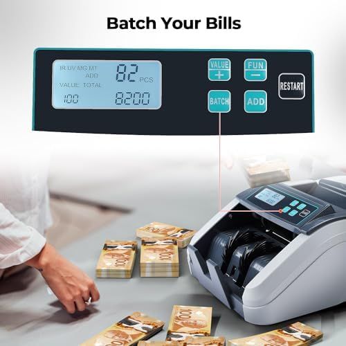 [Value Count] MUNBYN IMC51 money counter machine can count the value of bills in Value Mode. In conjunction with the Add mode, you can add up the value of different denomination bills. (Note: You cannot calculate the total of a mixed pile of notes!)\n[Add+Batch Mode] By setting a specific batch value, this bill counter machine can stop running after counting a predetermined number of bills. This will facilitate the separation of bills into specific quantities. When used in conjunction with the Add and Batch Mode, the machine can both total the number of bills while bundling them simultaneously.\n[Precise Detection] This currency counter uses UV/IR/MG/MT detecting technology to examine the bills using Magnetic, Infrared, Ultraviolet, Dimensional, Thickness, Security Line, Variable Ink, Spectrum, and Fluorescence Detection techniques to completely protect your company from false bills.\n[Fast and smooth] The IMC51 cash counter machine has a counting speed of 1100 bills per minute. Upgraded roller processing for old bills provides an advantage for counting creased bills. This ensures that you can quickly complete your daily financial counting job.\n[100% Satisfaction] Committed to providing a comprehensive money-handling solution, MUNBYN has a complete product line and technical assurance. For all our products, we provide- 1. 24-hour technical support available on weekdays. 2. Local fix point.\n[Detect old canadian banknotes] For old versions of Canadian banknotes that are no longer in circulation, you need to turn off the MG function option before counting. By pressing the FUN button, turn off the MG function.\n[Notice] ①Please put the bills in the right way to avoid the error report! ②This money counter can not count mixed bills. It is necessary to manually separate bills of various denominations before adding each stack of bills one at a time to the value.