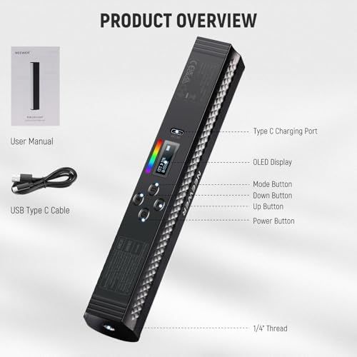 【Versatile Photography Light Stick】 With 195 powerful LEDs, this 10W full color RGB light delivers a max illuminance of 730lux at 0.5m, with a 95+ CRI for more accurate color rendition without flicker or glare. It measures 9\" x 1.6\" x 1.8\" / 228 x 40 x 45mm, and weighs only 9.5oz/270g, allowing for single hand grip and is ideal for selfies, vlogging, filming, live streaming, parties, weddings, camping, still life photography, studio artistic photoshoots, YouTube/TikTok video recording, etc.
