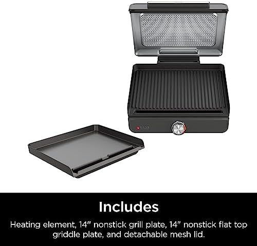 WHAT’S INCLUDED: Ninja Sizzle Indoor Grill & Griddle, 14’’ Nonstick Grill Plate, 14’’ Nonstick Flat-Top Griddle Plate, & Quick Start Guide with 10 Recipes.