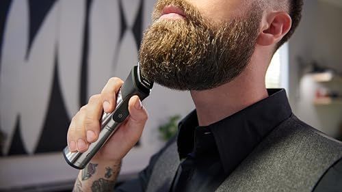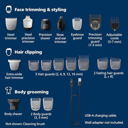 The Philips Norelco Multigroom 9000 provides stainless steel precision with 21 tools and accessories in a premium storage case for a perfect beard, hair and body trim. With precision trimming guard, select length settings in 0.2 mm steps from 1 to 3 mm for a precise trim to the exact length you want. Smart BeardSense Technology scans the beard density 125x per second and boosts power exactly when you need it to tackle also dense, bushy or longer beards. The body shaver/ manscaping attachment efficiently shaves body hair, even on sensitive areas, while protecting skin. The self-sharpening stainless steel blades remain sharp as day one for long lasting performance, no oil required. USB-A charging cable included (wall power adapter not included).