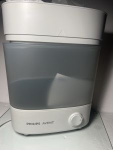 Kills 99.9%¹ of germs with natural steam, with no chemicals required; compatible with Philips Avent range - you can use it for baby bottle, breast pump, breast milk storage bottles, and dummies\nSterilizes in just 6 minutes² with the press of a button - the progress indicator light tells you when contents are sterile; the device keeps its content sterile for up to 24 hours with the lid on\nPhilips Avent Baby Bottle Sterilizer and Dryer Premium dries with hot, filtered air; all necessary baby items are sterilized, dry and ready for the next feed in 40 minutes\nWith room for 6 bottles and other baby necessities like nipples, soothers and manual breast pump parts; it fits on most countertops with its modular, compact design\nThe new drip tray protects the heating plate from milk droplets, reducing the risk of unpleasant odors; the electric steam sterilizer is easy to clean\nThe set includes: 1x electric steam sterilizer and dryer, 1x tongs\n› See more product details