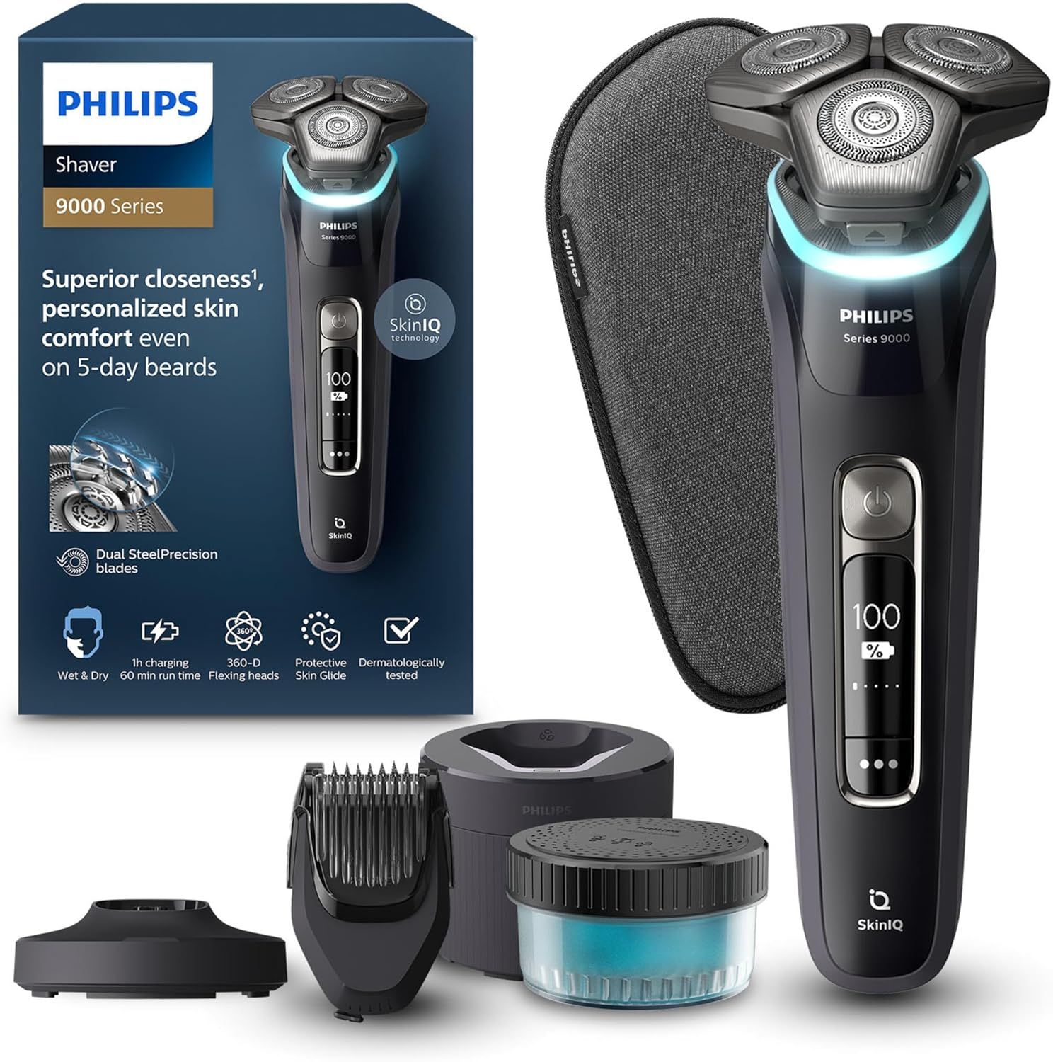 The set includes: 1x Philips Shaver Series 9000, 1x Quick Clean Pod , 1x pop-up trimmer, 1x Beard Styler, 1x charging stand, 1x travel case, 1x cleaning brush