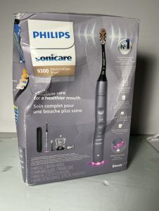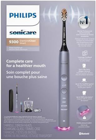 The set includes: 1x DiamondClean Smart 9300 sonic electric toothbrush, 1x A3 Premium All-in-One brush head, 1x C3 Premium Plaque Control brush head, 1x charging glass and stand, 1x travel case