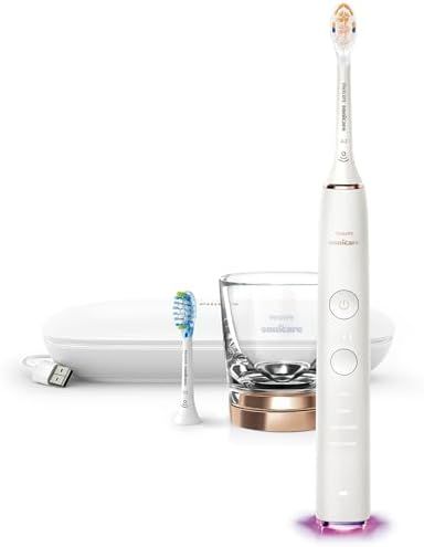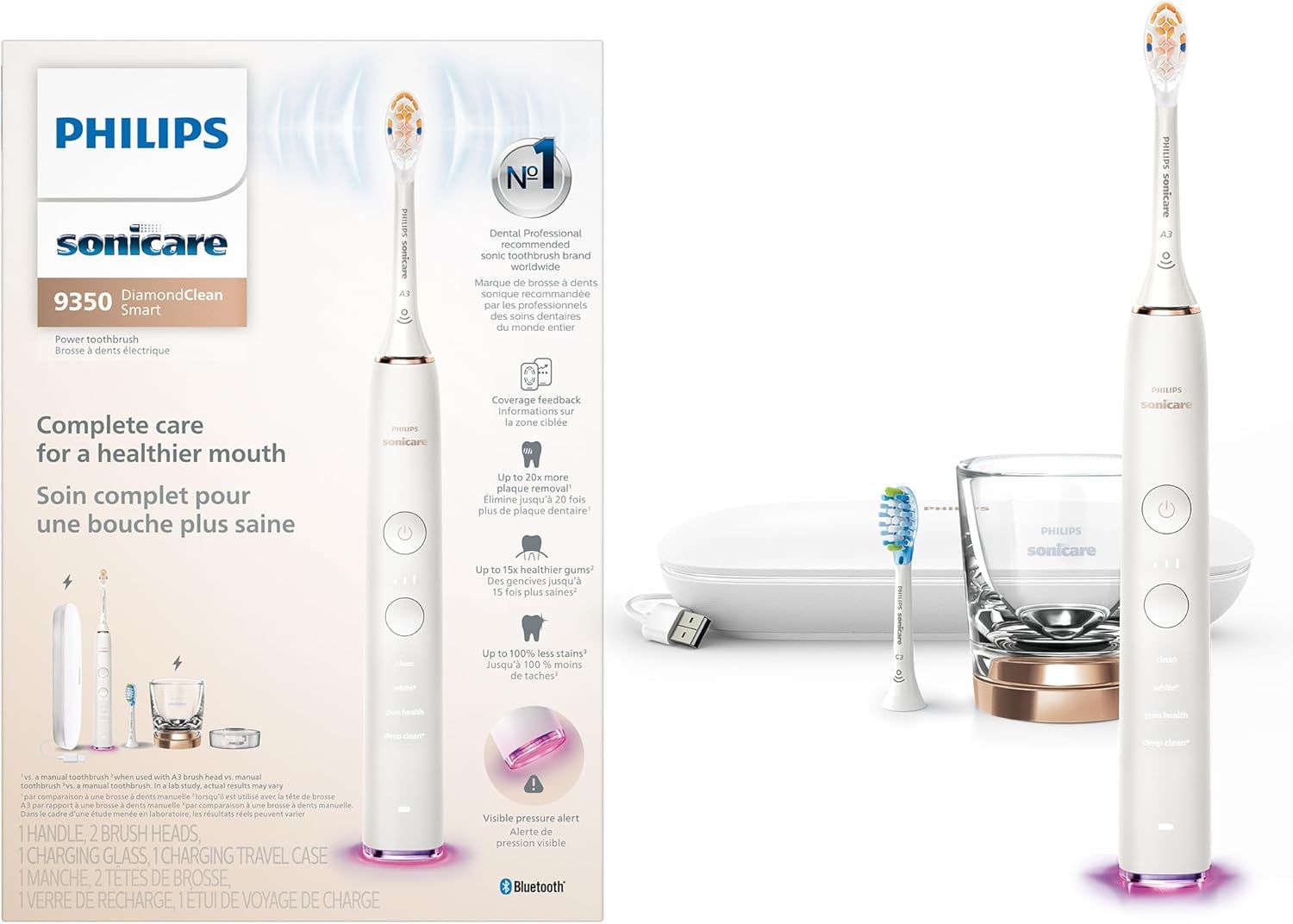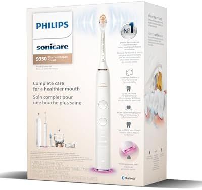 Advanced sonic toothbrush for improved oral health: achieve up to 20x more plaque removal¹, up to 15x healthier gums¹, and remove up to 100% more stains than a manual toothbrush Personalize your brushing with this innovative electric toothbrush: choose from 4 brushing modes and 3 intensity levels to meet your oral healthcare goals Real-time feedback: the light ring on the end of your handle will flash if you use too much pressure, reminding you to ease off the pressure and protect your teeth and gums Personalized guidance: connect your toothbrush to the Philips Sonicare app and receive personalized brushing guidance to maintain and improve your brushing habits #1 dental professional recommended sonic toothbrush brand worldwide³: benefit from Philips expertise to keep your teeth and gums in the best condition The set includes: 1x DiamondClean Smart 9350 sonic electric toothbrush, 1x A3 Premium All-in-One brush head, 1x C3 Premium Plaque Control brush head and more - see the \"what\'s in the box\" section