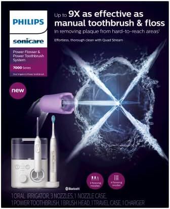 \"\nUp to 270% more effective than manual toothbrush plus floss in improving gum health\nQUAD STREAM TIP - Creates four wide streams of water for a thorough clean between the teeth and along the gum line.\nPULSE WAVE TECHNOLOGY - Gentle pulses of water guide you from tooth to tooth so that you won\'t miss a spot.\nWHISPER QUIET DESIGN - Engineered for a discreet clean, so you get great results without disturbing others.\n4 flossing modes, 10 intensities and includes ExpertClean 7300 with Bluetooth Sonicare App progress report and connected charging dock.\nIncludes 1 Power Flosser, 3 Nozzles, 1 Nozzle case, 1 Power Toothbrush, 1 Brush Head, 1 Toothbrush Travel Charger, 1 Toothbrush Travel Case\"