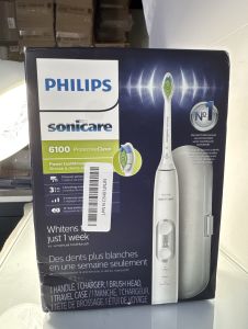 \\\\\\\"\\\\nWhiten\\\\\\\'s teeth in just 1 week vs. a manual toothbrush\\\\nPressure sensor protects teeth and gums from excess brushing pressure\\\\nAlways know when to replace your brush head for an effective clean with BrushSync replacement reminder\\\\n3 Intensity settings for maximum comfort\\\\nBattery charge indicator light let\\\\\\\'s you know when to recharge; 2 week battery life\\\\n1 Philips Sonicare 6100 handle, 1 charger, 1 DiamondClean brush head, 1 travel case\\\\\\\"