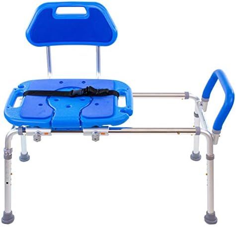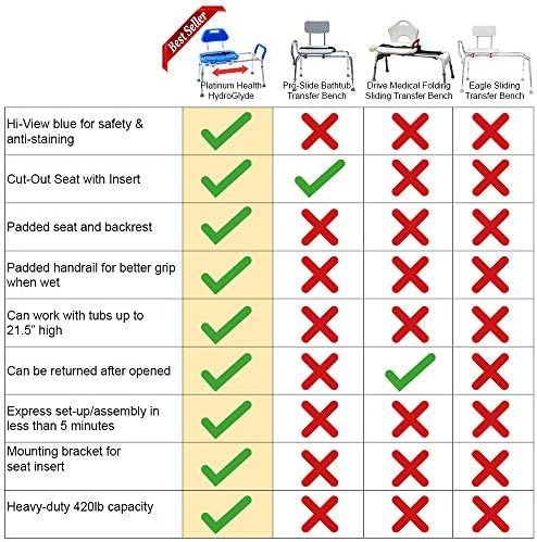 Aluminum and Polyurethane Foam\nPROFESSIONAL GRADE sliding transfer shower bench, bath, and shower chair for inside shower. Effortless sliding for safe, easy transfers in and out of the tub or shower. Platinum Health products are used in thousands of hospitals, nursing homes, and private homes by users who value quality, safety, convenience, and comfort over price. This easy to assemble bath chair requires a quick TOOLS-LESS assembly in less than 5 minutes. 100% reversible.\nSEAT CUTOUT WITH INSERT. The commode opening on this bath chair shower chair for seniors allows for unobstructed access to the perineal area for easy and effective washing. A snap-in insert section is included that can be easily and quickly added and removed from the seat as desired. A mounting bracket keeps the insert section within arms reach. Safety belt included. PLEASE REVIEW THE DIMENSIONS SHOWN IN THE LINE DRAWING BEFORE ORDERING TO ENSURE THIS ITEM WILL THE USER AND LOCATION.\nINSTITUTIONAL QUALITY DESIGN/BUILD. The frame of the HydroGlyde is manufactured with lightweight yet robust aluminum components. It will never rust and the durable construction helps with any wobbling, shaking, or tipping. 420lb Capacity. Overall Height (Floor to Top of Backrest): 35” highest/30” lowest, Overall Frame Length: 38”, Overall Frame Depth: 20” at highest; 22” at lowest, Height from Floor to Crossbar: 18.5” highest/14” lowest, Seat Dimensions: 13” x 16”, Seat to Top of Backrest: 12”\nPADDED SHOWER SEAT AND BACKREST for exceptional comfort. WARM to the touch compared to old-style hard plastic. The smooth gliding shower chair for bathtub eliminates the dangerous need to shuffle across the bench like non-sliding bath benches that can often lead to skin tears, knee and hip joint strain as well as falls. Note: OPTIONAL LEG EXTENSION KITS AND HORIZONTAL TRAVEL EXTENSION KITS ALSO AVAILABLE.\nHI CONTRAST COLOR FOR SAFETY. Our unique HI-VIEW BLUE color makes the key parts of this handicap shower chair with arms much easier to see by vision-impaired users. Rather than blending in with the background like old-style white benches, the blue contrast color helps users distinguish the chair from its surroundings and significantly reduces slips, trips and falls- the leading cause of death by injury in people over 65. RESISTS STAINING AND DISCOLORATION compared to white benches.